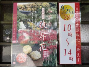 西方寺の彼岸花をモチーフにした和菓子を作ってくれました。その他の和菓子も販売予定です。